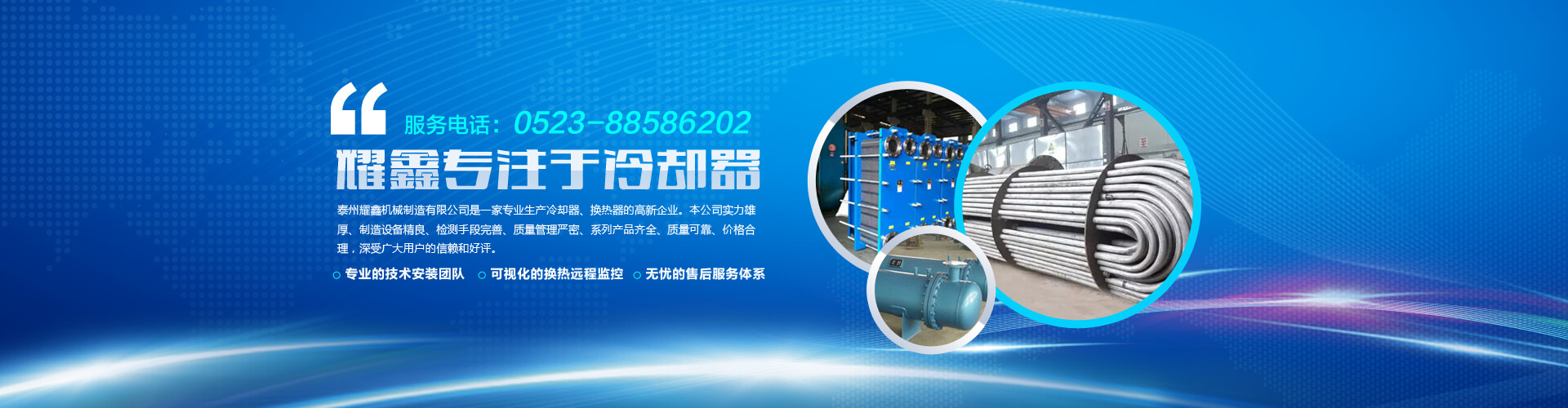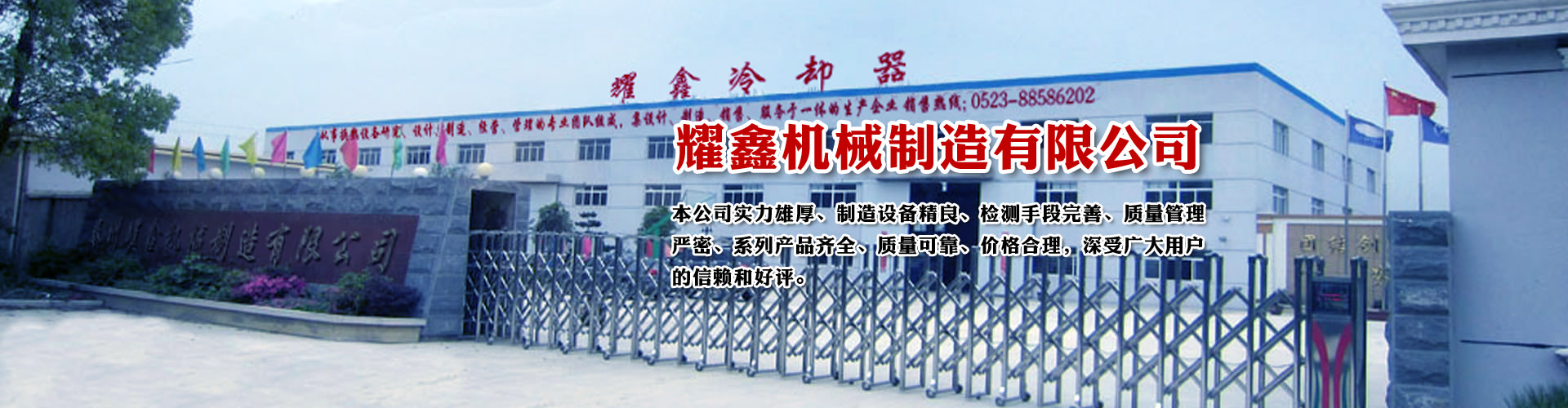 泰州耀鑫機械制造有限公司座落于風景如畫的江蘇魚米之鄉--全國文明城鎮婁莊鎮,是一家專業生產風冷卻器、列管式冷卻器、板式冷卻器的企業。本公司實力雄厚、制造設備精良、檢測手段完善、質量管理嚴密、系列產品齊全、質量可靠、價格合理,深受廣大用戶的信賴和好評。